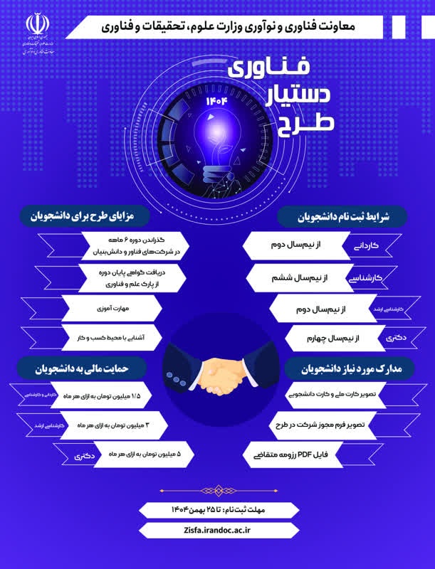 مقاطع: کاردانی، کارشناسی، کارشناسی ارشد، دکتری  حمایت مالی: از ۱/۵ تا ۵ میلیون تومان به صورت ماهانه  مهلت ثبت‌نام: تا ۲۵ بهمن ۱۴۰۴  ثبت نام طرح دستیار فناوری 1404 وزارت علوم برای رشته های فناوری اطلاعات، هوش مصنوعی، مهندسی صنایع، مهندسی برق، مهندسی شیمی، کشاورزی، مدیریت صنعتی، کسب و کار و کارآفرینی، معدن، هنر، مهندسی انرژی، الکترونیک، مکاترونیک، طراحی صنعتی، ساخت ماشین آلات و تجهیزات و مواد پیشرفته فراهم شده است متقاضیان میتوانند از طریق لینک زیر درخواست خود را در سامانه ثبت نمایند. آدرس سایت: https://zisfa.irandoc.ac.ir  یک قدم تا ورود به بازار کار فناوری!